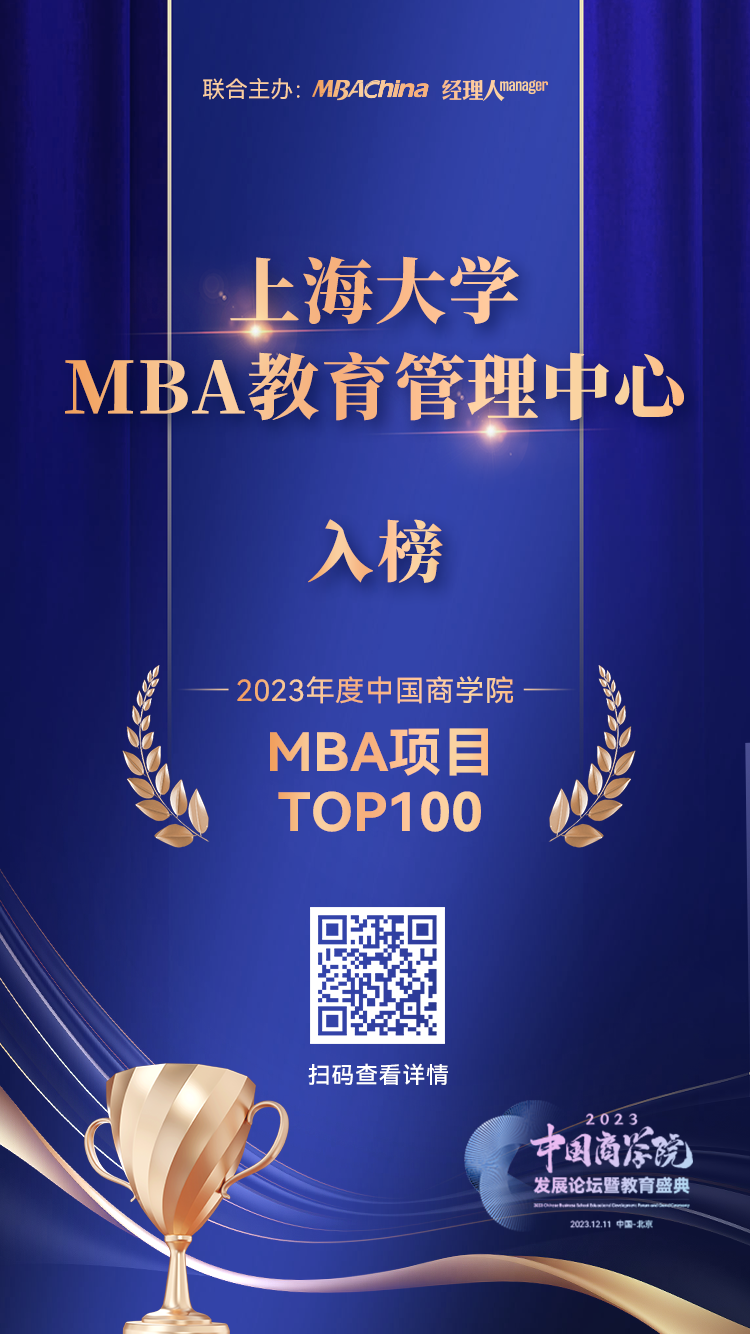 上海大学MBA凭借卓越的教学实力和创新能力,入选“2023年度中国商学院MBA项目TOP100”第35位,这是对上海大学MBA多年来努力肯定,也是对中国商科教育发展的有力推动。