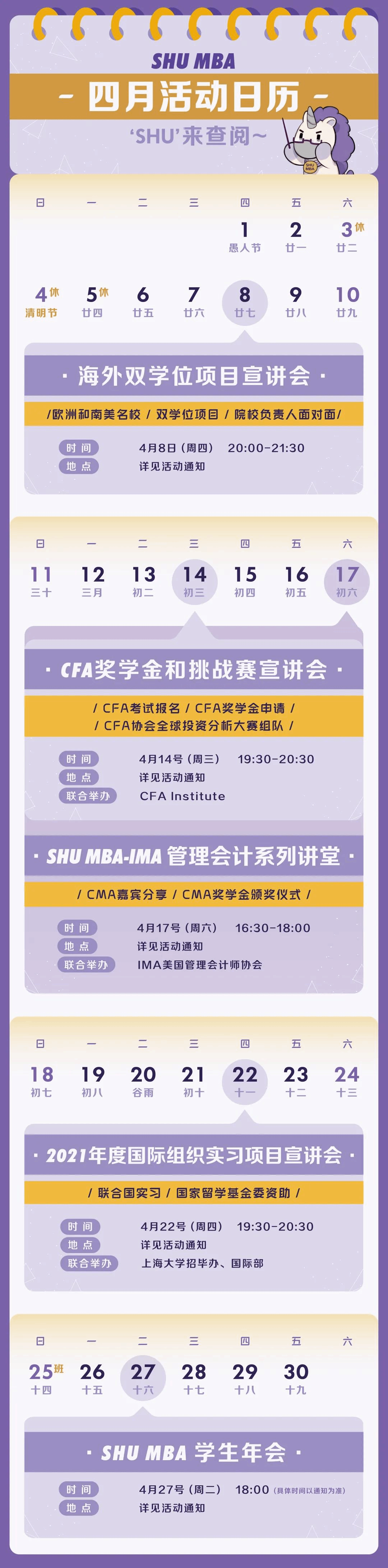 人间四月,芳菲十里。在这春光明媚的四月天,SHU MBA都有哪些活动即将举行呢?一起来点开今天的推送,SHU来查阅好事不断的 <SHU MBA 四月活动日历 >