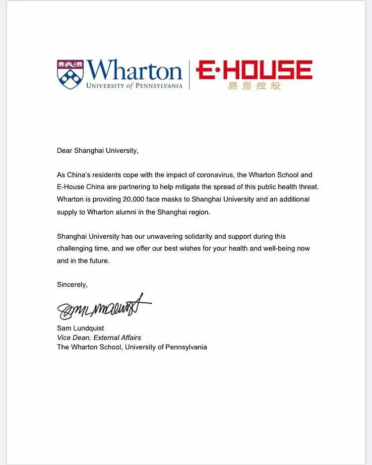 此次疫情爆发后,远在美国的沃顿商学院主动联系学校,提出捐赠一批紧缺的防疫物资,并于最短的时间内运送到学校。分管对外事务的Sam Lundquist副院长还特意发来了信件、录制了视频。Sam院长表示,他们非常关心中国的疫情发展,时刻牵挂着合作院校和广大校友。在这严峻的时刻,沃顿商学院会与上海大学团结一心,共克时艰,为上海大学提供尽可能的支持和帮助,同时送上祝福。上海大学与沃顿商学院的合作对学校追卓越、创一流具有重要的指标意义,希望沃顿与上大之间爱心、互助、合作的这份真情在未来得以不断延伸,为双方的合作奠定更坚实的基础。