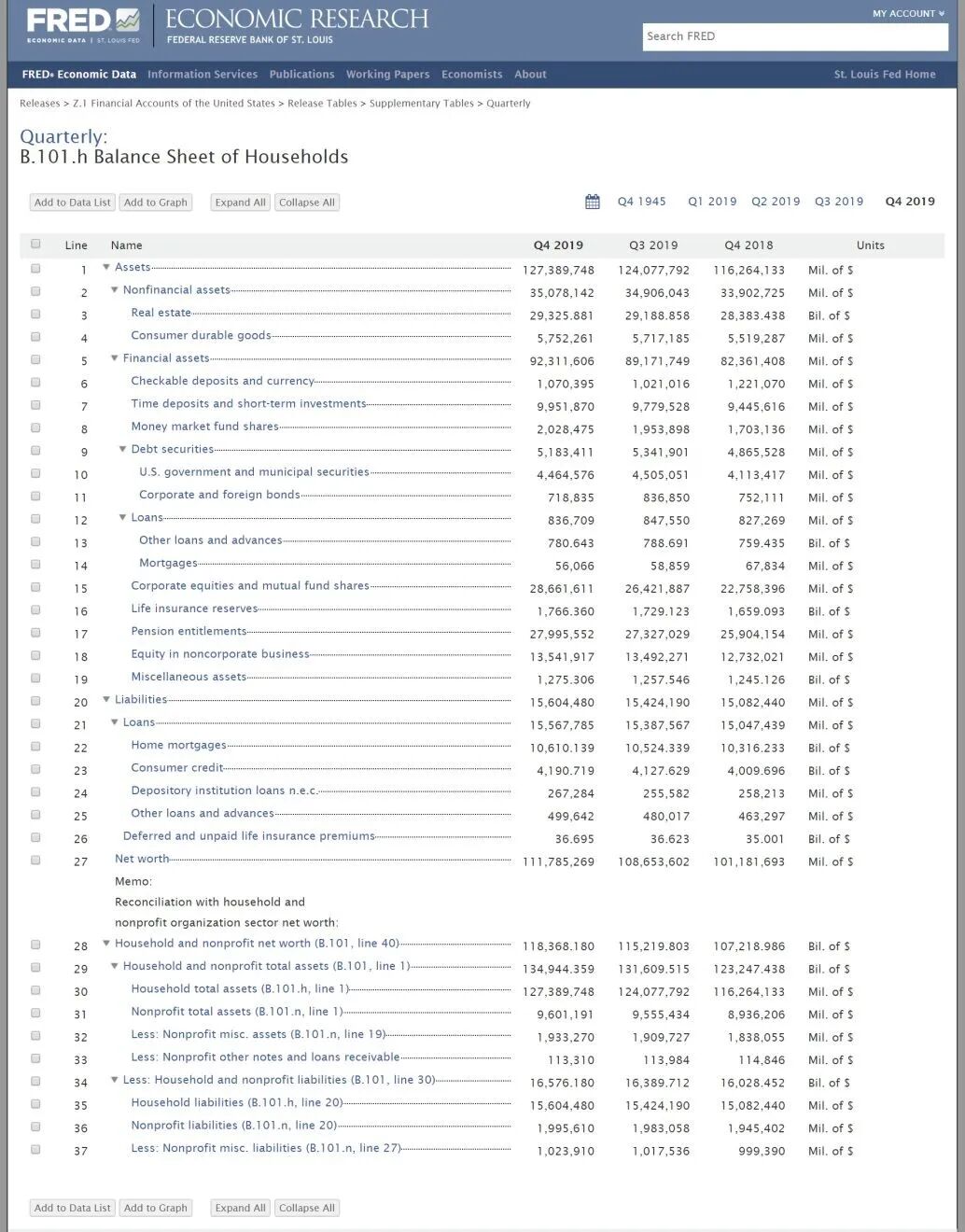 Q4美国居民家庭资产规模达到127.39万亿美元,金融资产总计92.31万亿,占总资产比重达到72.46%,同比2018Q4提升1.62%;家庭持有的权益和共同基金资产总计28.66万亿,占金融资产的比重为31.05%,接近三分之一,同比增速达到3.42%;权益和共同基金资产占总资产的比例也由2018Q4的19.57%上升至2019Q4的22.50%。可见,美国家庭持有的权益及基金类资产的比重很高。
