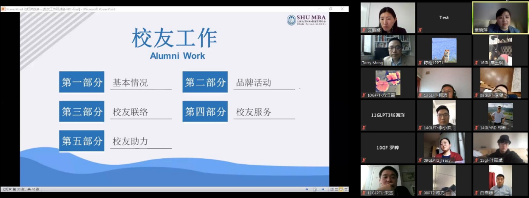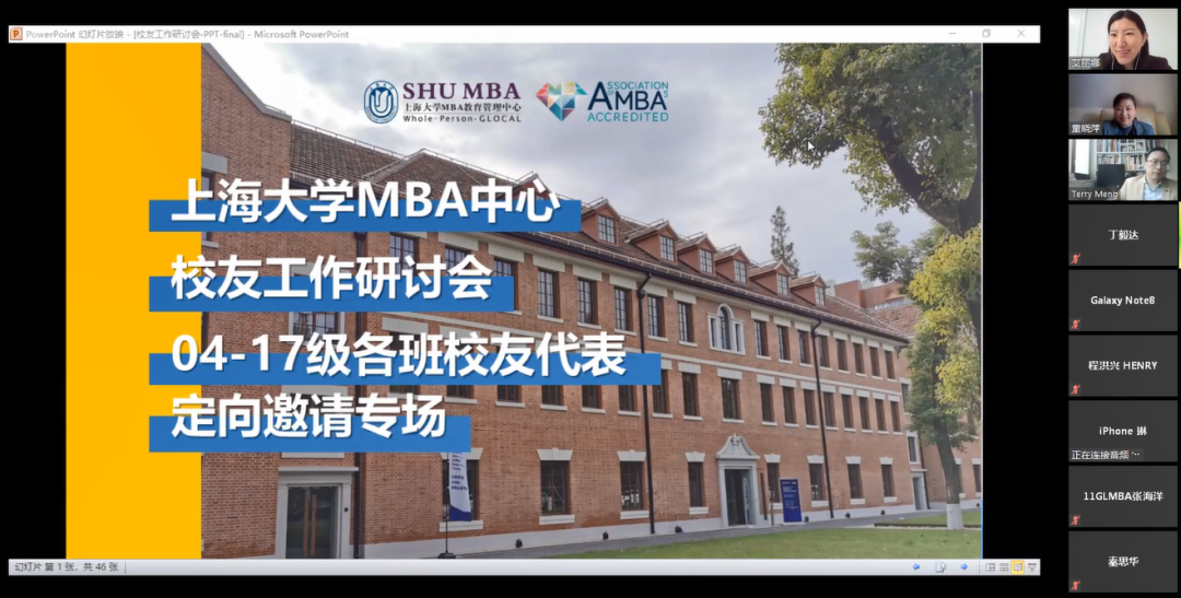 本着重视校友终身发展、助推校友在自身事业领域蓬勃发展之目的,也为积极促进上大MBA与校友情感、信息的互动交流,更为实现资源有效互通,同创上大MBA与校友双赢共进之和谐局面,4月12日上海大学MBA中心召开了线上校友工作研讨会。04级-17级近60位校友代表与会,全方位了解上大MBA整合各界资源致力搭建的校友服务平台,也为母校上大及MBA的发展献计献策,积极助力。疫情虽拉宽了彼此空间距离,但无法阻止一颗颗“共盼美好”心灵的交流与一份份“甘于奉献”、“乐于反哺”思维火花的碰撞,线上视频会议取得圆满成功。
