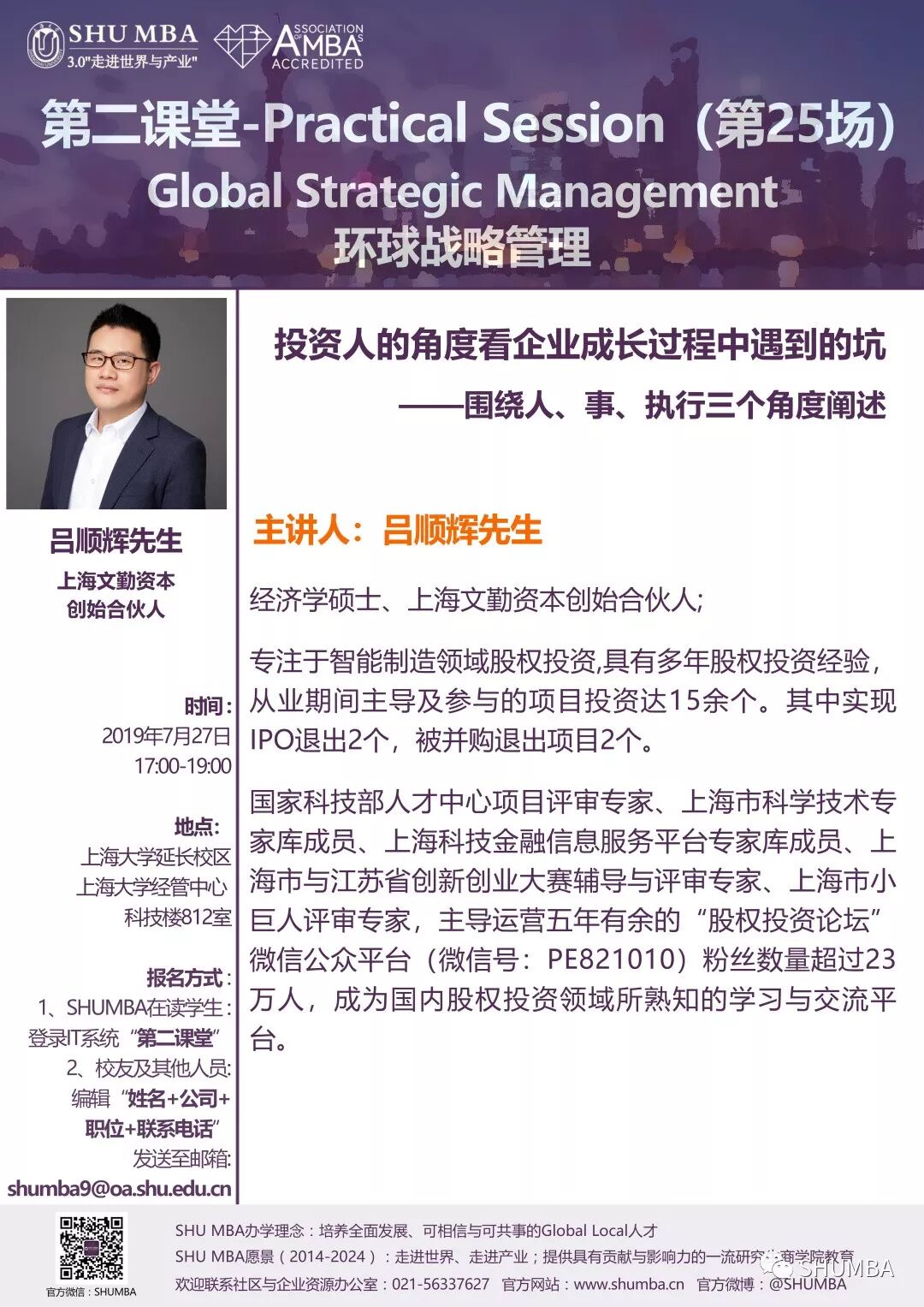 7月27日,SHU MBA Practical Session第25场——环球战略管理,将邀请上海文勤资本创始合伙人——吕顺辉先生,以投资人的角度,总体围绕人、事、执行三个角度,与同学聊聊“企业成长过程中遇到的坑”!