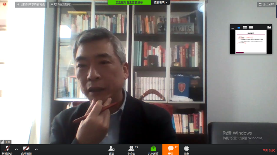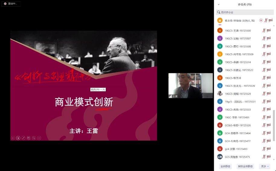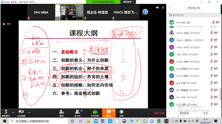 授课中王老师从容淡定,有条不紊,用他扎实的理论功底和三十多年来从业的丰富实践经验,以及接触到的各种案例,与同学们一起分享并开展积极的互动,帮助学生理解创新创业概念,以拓宽他们的创新创业思路。在互动中王老师提出了创新组织和非创新组织主要区别的问题,同学们反映热烈,踊跃参与。有四位同学分别从创新组织必须具备主动出击、培养创新土壤、创新思维等特质阐述了自己的观点。老师在给予同学们充分肯定的基础上,及时分析、归纳,引导大家更深层次的思考。由于MBA同学背景多元,阅历丰富,大家感到这种网上师生互动及时、有趣、有序,很受益。