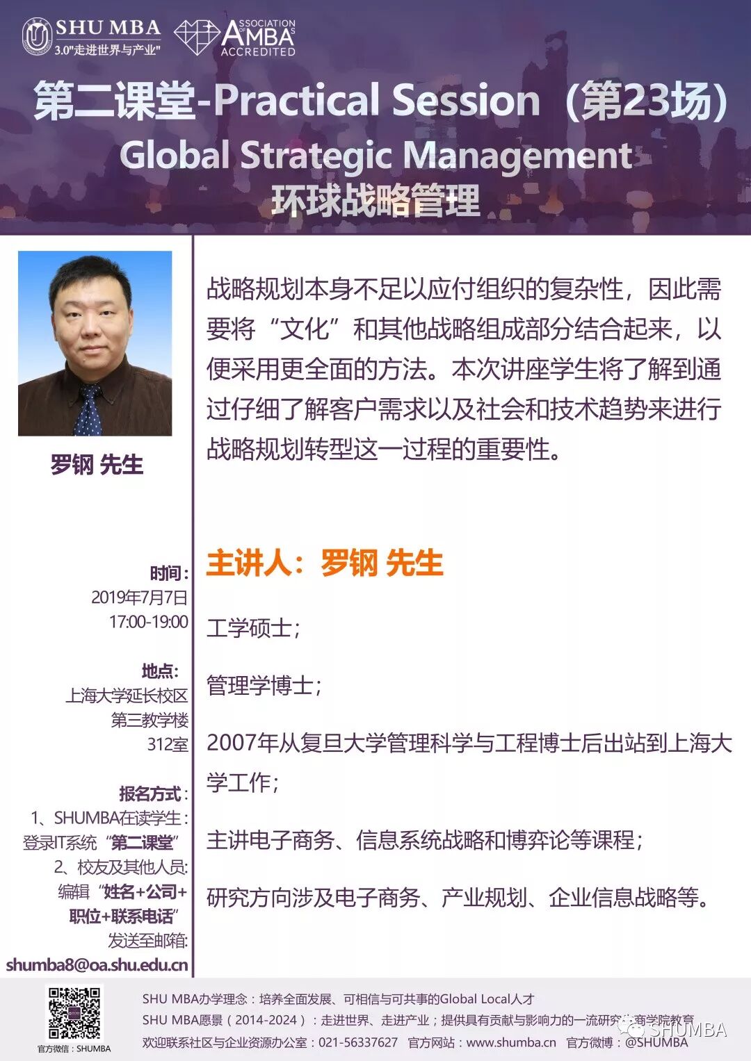 7月7日,管理学科博士后——罗钢先生将作客SHU MBA,把GSM系统知识与实际工作结合,为大家带来GSM的practical session,帮助同学们为日后实践工作做准备。详情请戳——SHU MBA Practical Session(第23场)举行在即